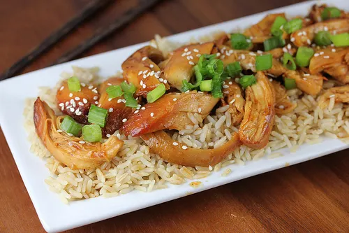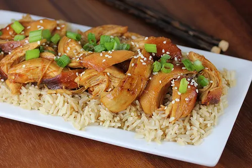 - Return the chicken to the slow cooker and toss with the sauce. Serve over cooked rice if desired. Top with sesame seeds and sliced green onions.