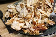 - Once the chicken has finished cooking, remove the chicken breasts and place them onto a cutting board, leaving the sauce in the slow cooker. Shred the chicken into bite-sized pieces using two forks. Set aside.