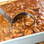 Smoked sausage is a delicious addition to baked beans. This recipe makes a great side dish to go with all kinds of different meals. I served it with grilled chicken. Canned pork and beans are mixed with various ingredients and then baked in the oven. The smoked sausage is first cooked in the pan and then mixed with the beans. If you want you can prepare this recipe in a Dutch oven. This recipe gets a lot of flavor from ingredients such as molasses, apple cider vinegar and mustard. Enjoy.